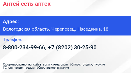 Антей, сеть аптек по адресу Вологодская область, Череповец, Наседкина, 18 в дальнейшем Организация, размещена в следующих категориях:
