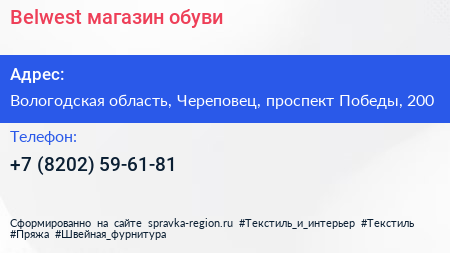 Belwest, магазин обуви по адресу Вологодская область, Череповец, проспект Победы, 200 в дальнейшем Организация, размещена в следующих категориях: