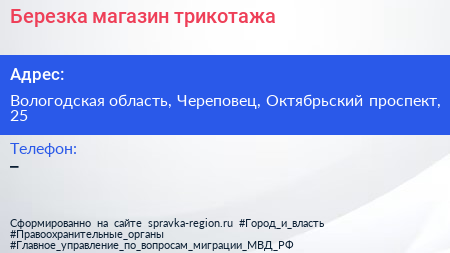 Березка, магазин трикотажа по адресу Вологодская область, Череповец, Октябрьский проспект, 25 в дальнейшем Организация, размещена в следующих категориях:
