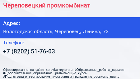 Череповецкий промкомбинат по адресу Вологодская область, Череповец, Ленина, 73 в дальнейшем Организация, размещена в следующих категориях: