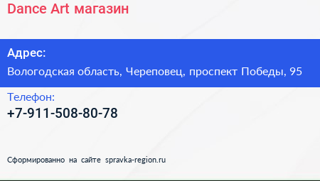 Dance-Art, магазин по адресу Вологодская область, Череповец, проспект Победы, 95 в дальнейшем Организация, размещена в следующих категориях: