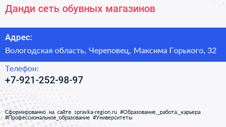 Данди, сеть обувных магазинов по адресу Вологодская область, Череповец, Максима Горького, 32 в дальнейшем Организация, размещена в следующих категориях: