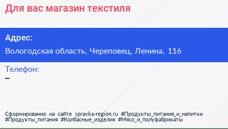 Для вас, магазин текстиля по адресу Вологодская область, Череповец, Ленина, 116 в дальнейшем Организация, размещена в следующих категориях: