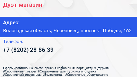 Дуэт, магазин по адресу Вологодская область, Череповец, проспект Победы, 162 в дальнейшем Организация, размещена в следующих категориях:
