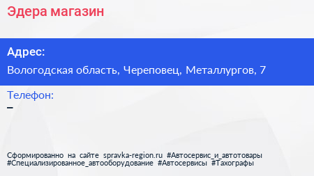 Эдера, магазин по адресу Вологодская область, Череповец, Металлургов, 7 в дальнейшем Организация, размещена в следующих категориях: