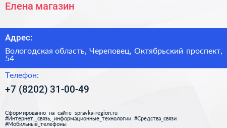 Елена, магазин по адресу Вологодская область, Череповец, Октябрьский проспект, 54 в дальнейшем Организация, размещена в следующих категориях: