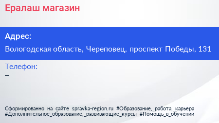 Ералаш, магазин по адресу Вологодская область, Череповец, проспект Победы, 131 в дальнейшем Организация, размещена в следующих категориях: