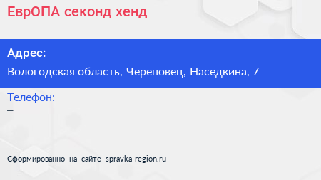 ЕврОПА, секонд-хенд по адресу Вологодская область, Череповец, Наседкина, 7 в дальнейшем Организация, размещена в следующих категориях: