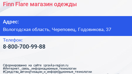 Finn-Flare, магазин одежды по адресу Вологодская область, Череповец, Годовикова, 37 в дальнейшем Организация, размещена в следующих категориях: