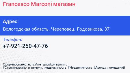 Francesco Marconi, магазин по адресу Вологодская область, Череповец, Годовикова, 37 в дальнейшем Организация, размещена в следующих категориях: