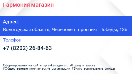 Гармония, магазин по адресу Вологодская область, Череповец, проспект Победы, 136 в дальнейшем Организация, размещена в следующих категориях: