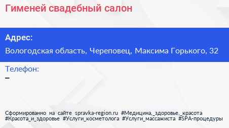 Гименей, свадебный салон по адресу Вологодская область, Череповец, Максима Горького, 32 в дальнейшем Организация, размещена в следующих категориях: