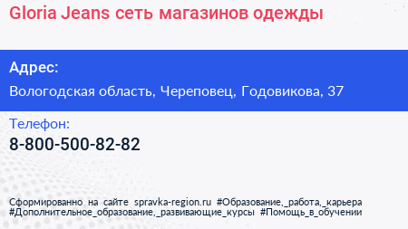 Gloria Jeans, сеть магазинов одежды по адресу Вологодская область, Череповец, Годовикова, 37 в дальнейшем Организация, размещена в следующих категориях: