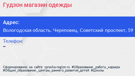 Гудзон, магазин одежды по адресу Вологодская область, Череповец, Советский проспект, 59 в дальнейшем Организация, размещена в следующих категориях: