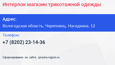 Интерлок, магазин трикотажной одежды по адресу Вологодская область, Череповец, Наседкина, 12 в дальнейшем Организация, размещена в следующих категориях: