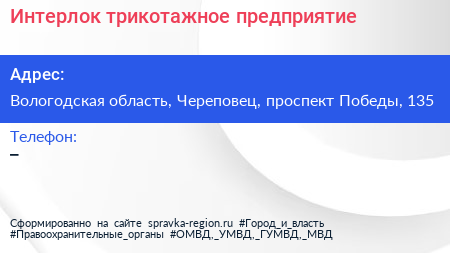 Интерлок, трикотажное предприятие по адресу Вологодская область, Череповец, проспект Победы, 135 в дальнейшем Организация, размещена в следующих категориях: