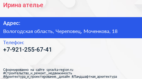 Ирина, ателье по адресу Вологодская область, Череповец, Моченкова, 18 в дальнейшем Организация, размещена в следующих категориях: