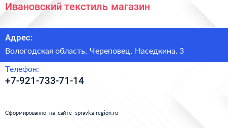 Ивановский текстиль, магазин по адресу Вологодская область, Череповец, Наседкина, 3 в дальнейшем Организация, размещена в следующих категориях: