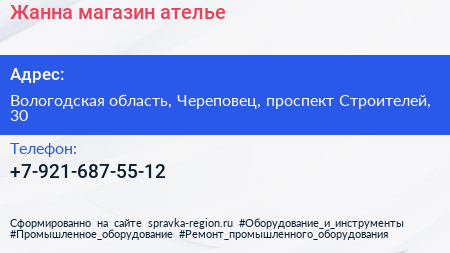 Жанна, магазин-ателье по адресу Вологодская область, Череповец, проспект Строителей, 30 в дальнейшем Организация, размещена в следующих категориях: