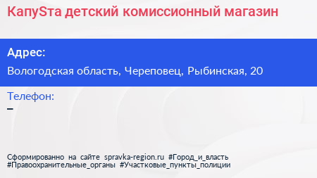 КапуSта, детский комиссионный магазин по адресу Вологодская область, Череповец, Рыбинская, 20 в дальнейшем Организация, размещена в следующих категориях: