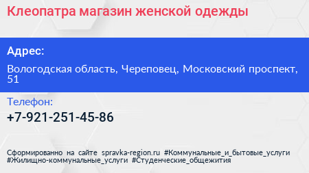 Клеопатра, магазин женской одежды по адресу Вологодская область, Череповец, Московский проспект, 51 в дальнейшем Организация, размещена в следующих категориях: