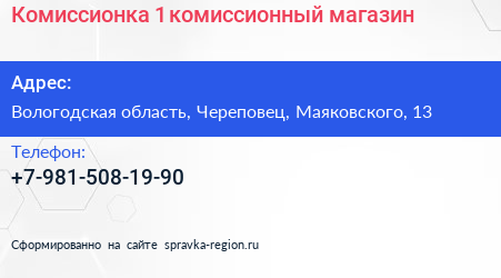 Комиссионка №1, комиссионный магазин по адресу Вологодская область, Череповец, Маяковского, 13 в дальнейшем Организация, размещена в следующих категориях: