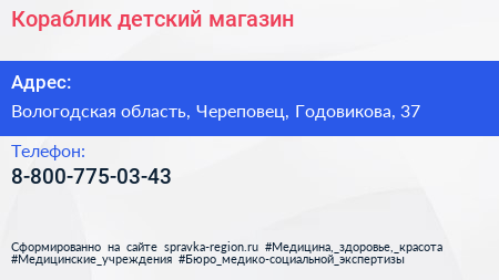 Кораблик, детский магазин по адресу Вологодская область, Череповец, Годовикова, 37 в дальнейшем Организация, размещена в следующих категориях: