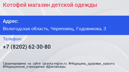 Котофей, магазин детской одежды по адресу Вологодская область, Череповец, Годовикова, 3 в дальнейшем Организация, размещена в следующих категориях: