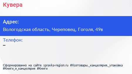 Кувера по адресу Вологодская область, Череповец, Гоголя, 49в в дальнейшем Организация, размещена в следующих категориях: