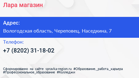 Лара, магазин по адресу Вологодская область, Череповец, Наседкина, 7 в дальнейшем Организация, размещена в следующих категориях: