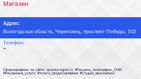 Магазин по адресу Вологодская область, Череповец, проспект Победы, 102 в дальнейшем Организация, размещена в следующих категориях: