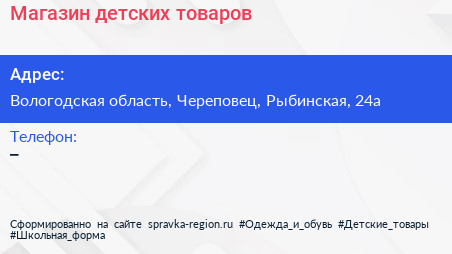Магазин детских товаров по адресу Вологодская область, Череповец, Рыбинская, 24а в дальнейшем Организация, размещена в следующих категориях: