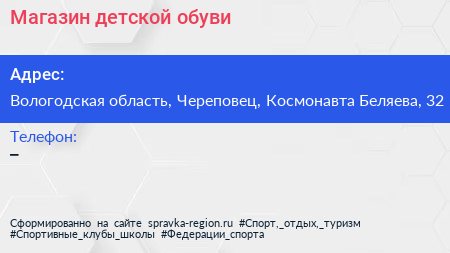 Магазин детской обуви по адресу Вологодская область, Череповец, Космонавта Беляева, 32 в дальнейшем Организация, размещена в следующих категориях: