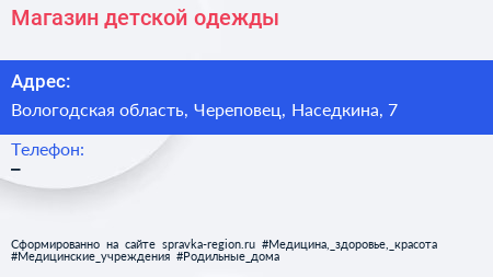 Магазин детской одежды по адресу Вологодская область, Череповец, Наседкина, 7 в дальнейшем Организация, размещена в следующих категориях: