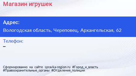 Магазин игрушек по адресу Вологодская область, Череповец, Архангельская, 62 в дальнейшем Организация, размещена в следующих категориях: