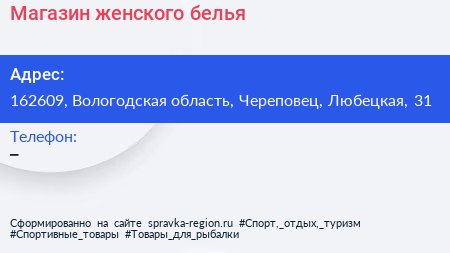Магазин женского белья по адресу 162609, Вологодская область, Череповец, Любецкая, 31 в дальнейшем Организация, размещена в следующих категориях: