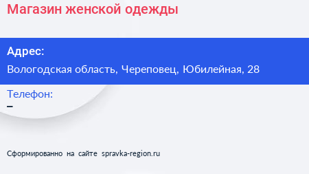 Магазин женской одежды по адресу Вологодская область, Череповец, Юбилейная, 28 в дальнейшем Организация, размещена в следующих категориях: