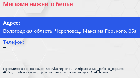 Магазин нижнего белья по адресу Вологодская область, Череповец, Максима Горького, 85а в дальнейшем Организация, размещена в следующих категориях: