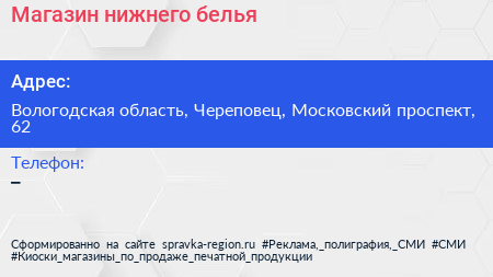 Магазин нижнего белья по адресу Вологодская область, Череповец, Московский проспект, 62 в дальнейшем Организация, размещена в следующих категориях: