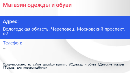 Магазин одежды и обуви по адресу Вологодская область, Череповец, Московский проспект, 62 в дальнейшем Организация, размещена в следующих категориях: