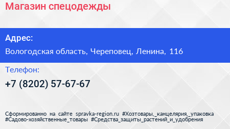 Магазин спецодежды по адресу Вологодская область, Череповец, Ленина, 116 в дальнейшем Организация, размещена в следующих категориях: