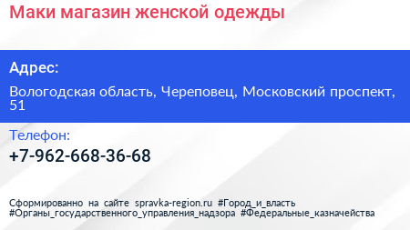 Маки, магазин женской одежды по адресу Вологодская область, Череповец, Московский проспект, 51 в дальнейшем Организация, размещена в следующих категориях: