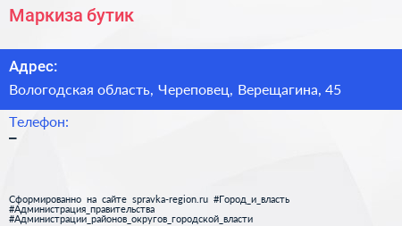 Маркиза, бутик по адресу Вологодская область, Череповец, Верещагина, 45 в дальнейшем Организация, размещена в следующих категориях: