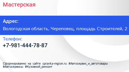 Мастерская по адресу Вологодская область, Череповец, площадь Строителей, 2 в дальнейшем Организация, размещена в следующих категориях: