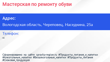 Мастерская по ремонту обуви по адресу Вологодская область, Череповец, Наседкина, 25а в дальнейшем Организация, размещена в следующих категориях: