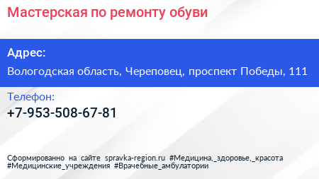 Мастерская по ремонту обуви по адресу Вологодская область, Череповец, проспект Победы, 111 в дальнейшем Организация, размещена в следующих категориях: