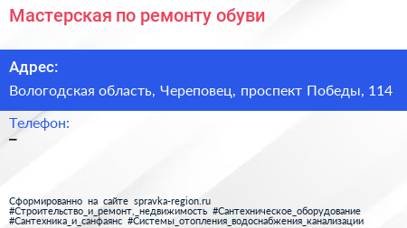 Мастерская по ремонту обуви по адресу Вологодская область, Череповец, проспект Победы, 114 в дальнейшем Организация, размещена в следующих категориях: