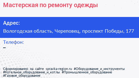 Мастерская по ремонту одежды по адресу Вологодская область, Череповец, проспект Победы, 177 в дальнейшем Организация, размещена в следующих категориях: