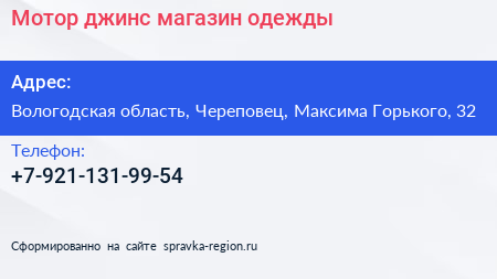 Мотор джинс, магазин одежды по адресу Вологодская область, Череповец, Максима Горького, 32 в дальнейшем Организация, размещена в следующих категориях: