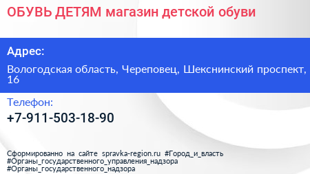 ОБУВЬ ДЕТЯМ, магазин детской обуви по адресу Вологодская область, Череповец, Шекснинский проспект, 16 в дальнейшем Организация, размещена в следующих категориях: